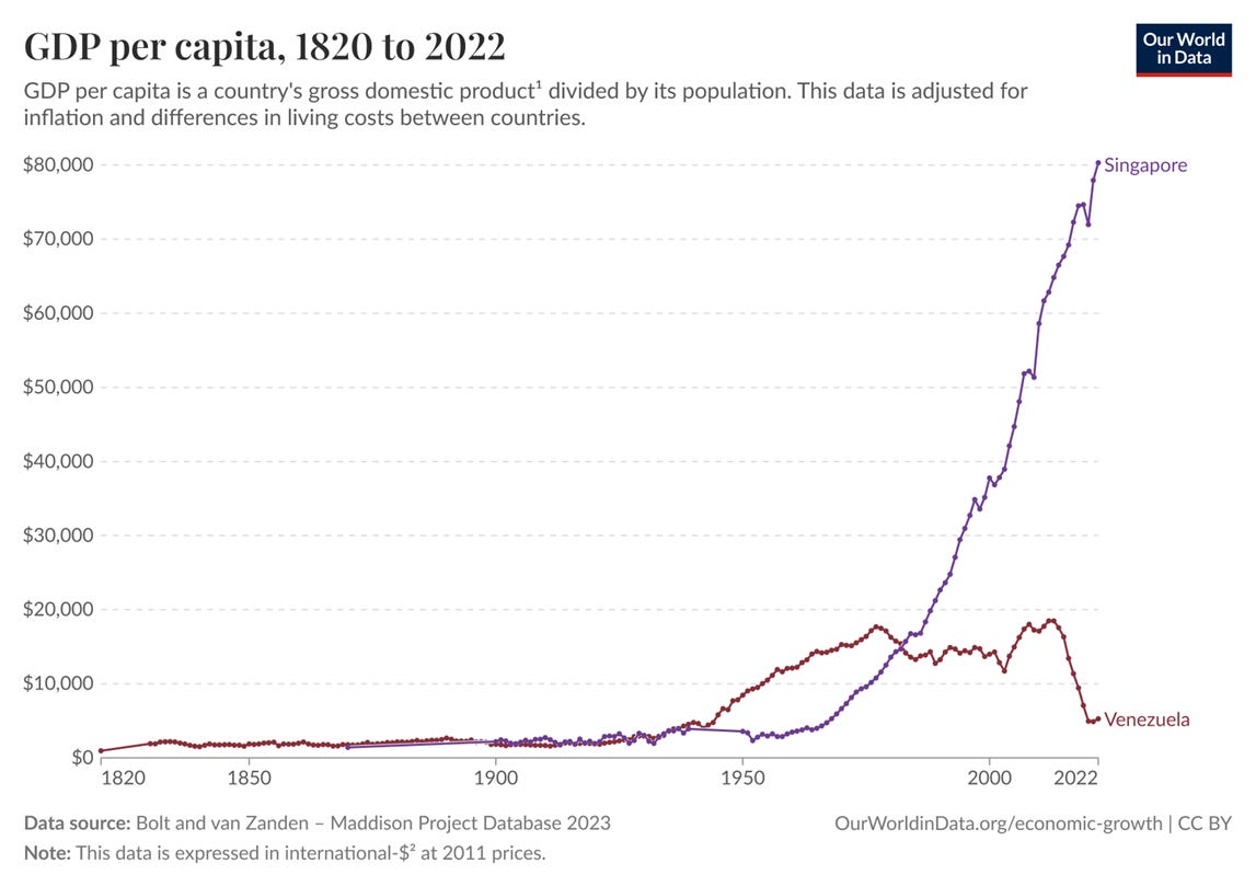 To see the tragedy of Venezuela, let me start with a bet. For years, I directed a program for Singapore’s Economic Development Board, and I would begin with a quiz. In 1975, which of the two countries would you bet on? (see data below).