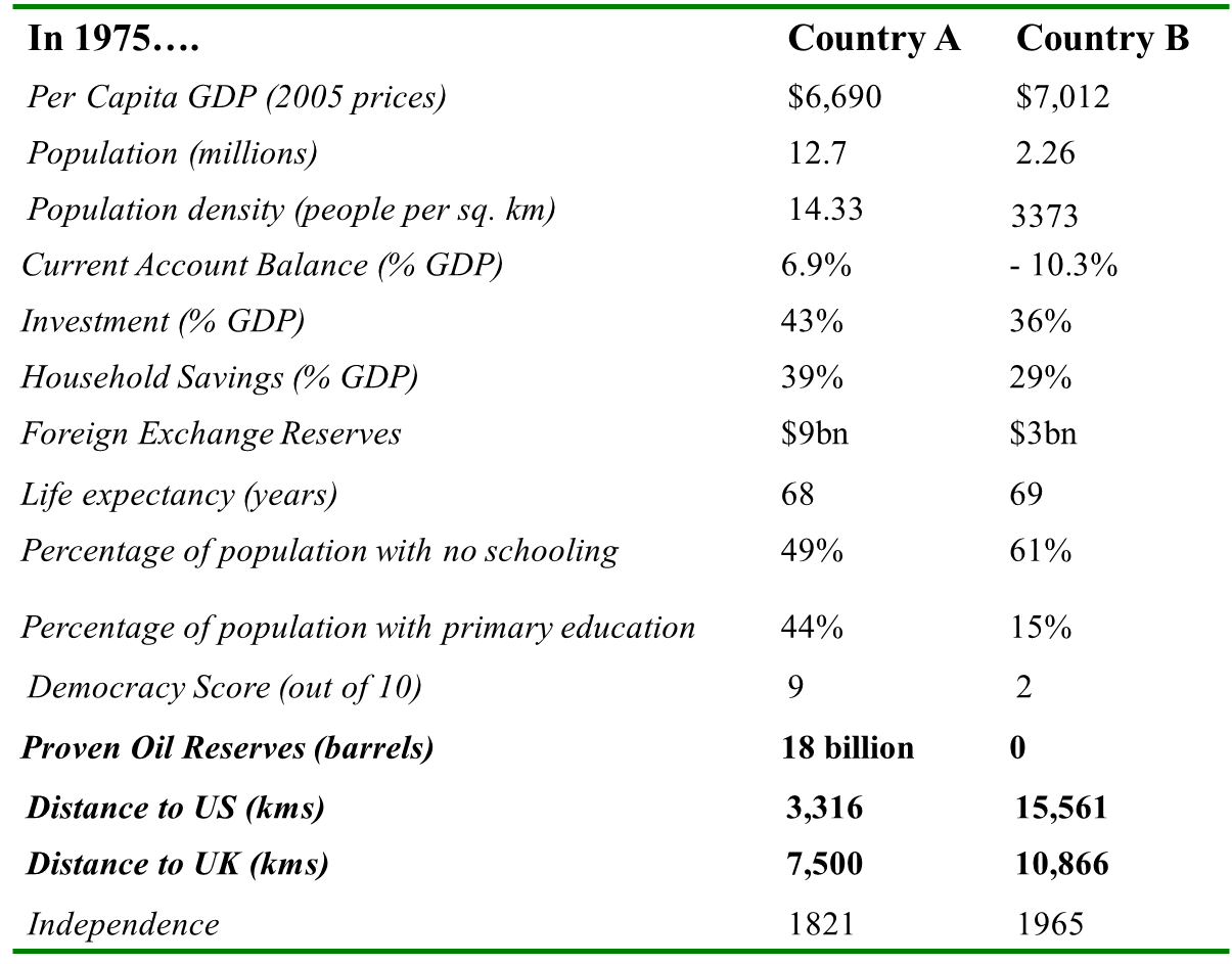 The answer is clear - almost all would bet on Country A instead of Country B. Country B has no natural resources, high population density, is far from major trading centers (access to trade and supply chains matters), and scores low on democracy.