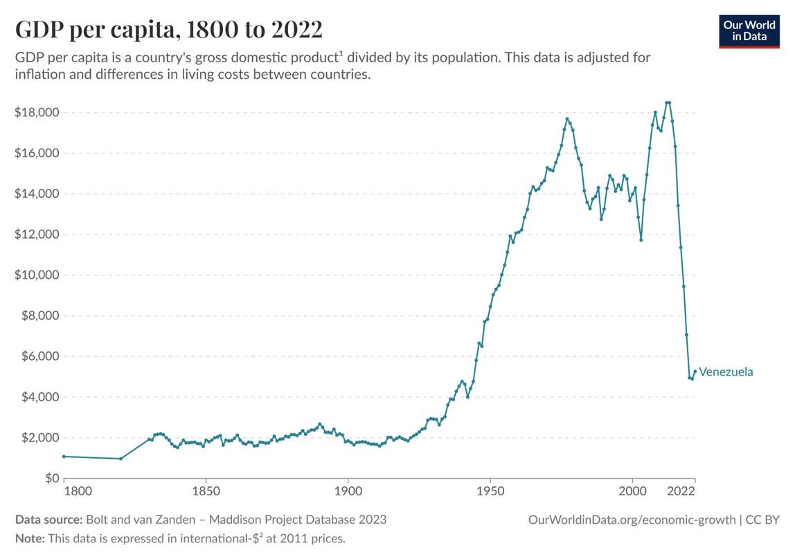 Many attribute the collapse to a single cause. For instance, Venezuelan economist Francisco Rodríguez argues that the US’s scorched earth sanctions in 2017 during the first Trump administration, triggered by an “uncompromising opposition,” decimated the oil industry but failed to initiate regime change. However, under Chávez and subsequently under Maduro, bad policies abounded and predated the 2017 sanctions. Most consequential was the mismanagement of PDVSA, which Chávez saw as a cash cow. Investments in PDVSA collapsed, its budget was raided to fund social programs and extract rents, and technocrats and engineers were fired. Pro-cyclical spending, double-digit fiscal deficits due to fuel and electricity subsidies, financed by loading obligations onto the state oil company (PDVSA), and monetary financing of deficits eventually triggered hyperinflation and a currency collapse. When oil prices started declining in 2014, the government responded with widespread expropriations, capital controls, and broad price and profit controls that crushed investment and domestic production. Venezuela’s oil turned out to be a curse. It fell victim to the Dutch Disease and lacked the institutions to benefit from its natural resources.